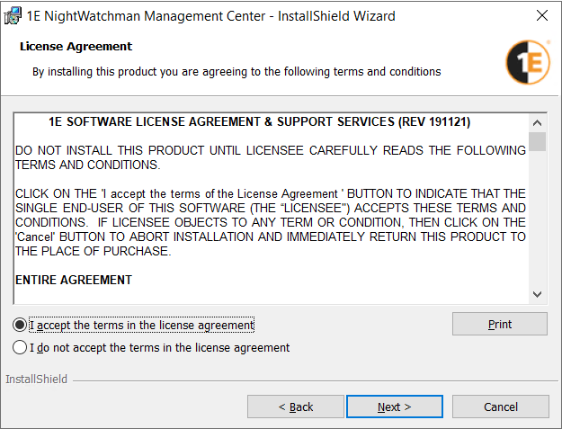 This screen provides the license agreement for NightWatchman Management Center. To accept, click I accept the terms in the license agreement