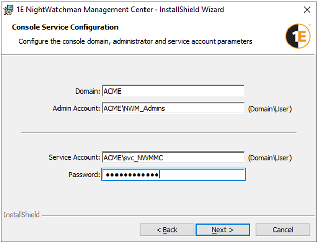 Enter the user name and password of the NightWatchman Management Center Console service account.