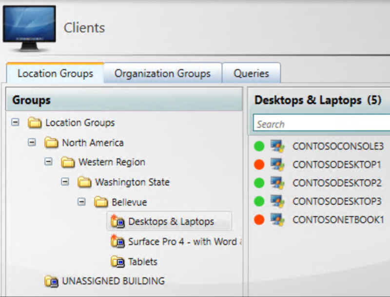 The NightWatchman console uses the platform to display traffic lights live status of its clients to indicate whether they are currently online or offline (or unknown). You can also check the status of groups within the NightWatchman client hierarchy.