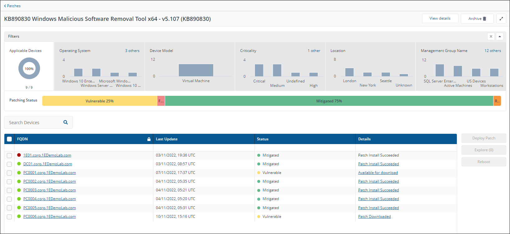 It is possible to drill down into the data to get a more granular view of where the patch has been deployed, and what state it is in on devices. Following any of the links in the row, apart from the