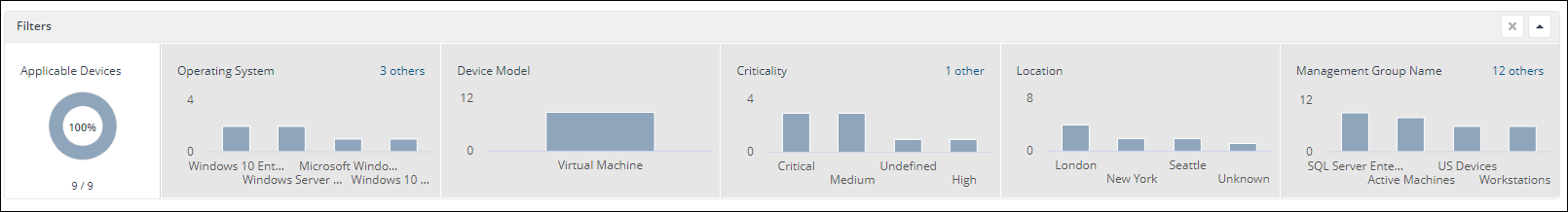 The Filters bar appears at the top of the pages in Patch Insights. Each section in the Filters bar allows a user to quickly and easily filter based on different categories. When a filter is set it applies to all the tiles on the page.