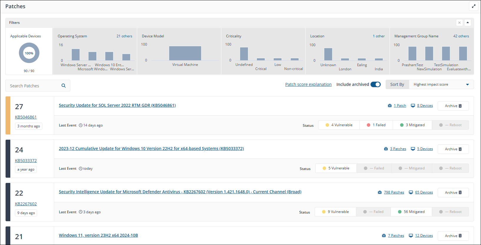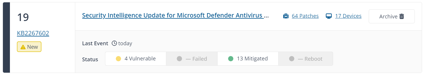 - Right column, top row: Displays the title of the patch, its KB, definition, and version (where available) To the right of the patch title is a count of the number of patches under this KB, the number of devices which report a requirement for this, and the option to archive the patch if it is not of interest.