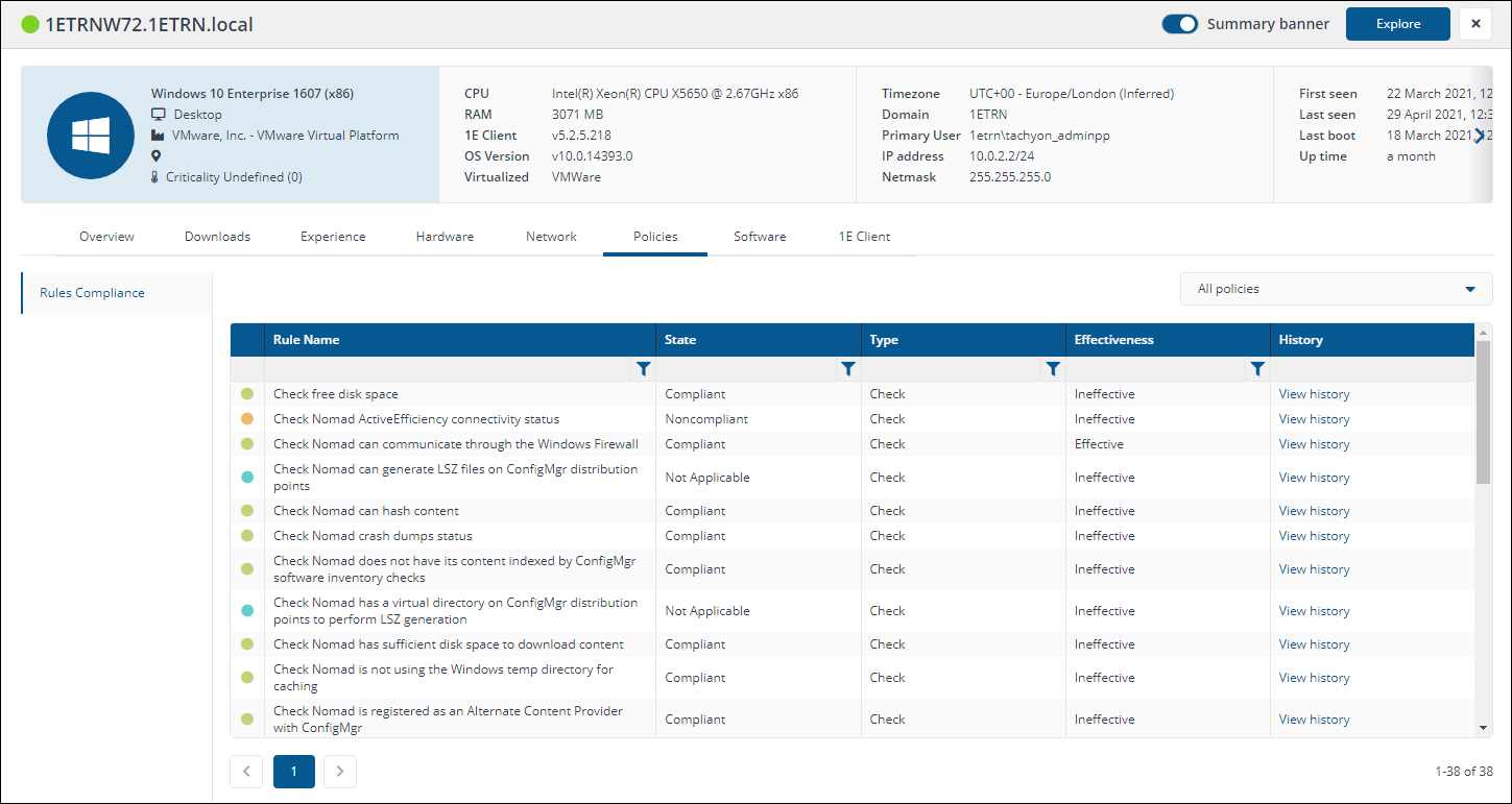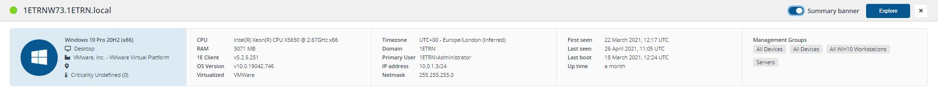 Displays a number of tiles sorted into Identification, Hardware and Operating System and Connectivity and Activity columns that show information for the selected device retrieved from the online status information stored in the 1EMaster database.