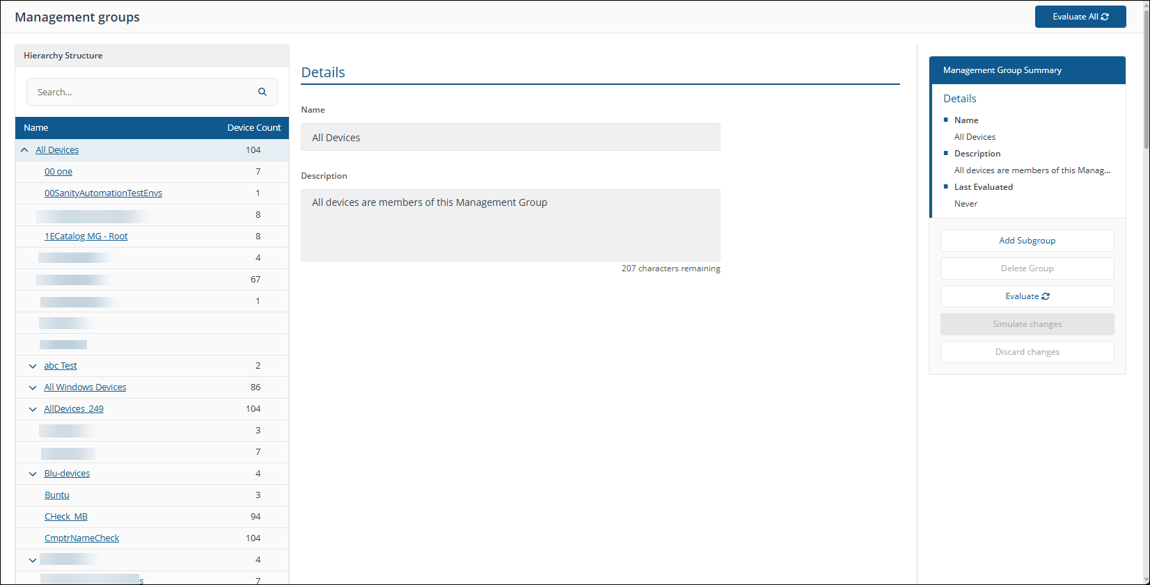 Management Groups page Management Groups are containers used to group devices and the software installed on those devices. Management Groups are defined using configurable rules that look at various properties of the devices and their installed software, these are then evaluated to determine the group membership. This means that Management Group membership adapts to changes to the devices and software in your environment. |