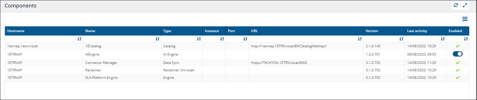 A check in this column shows that the component is enabled. If this cell for a component is blank the component is not enabled. The AIEngine component can be turned on or off using the toggle control. Slide the toggle to the left to turn the AI feature off or to the right to turn the AI feature on. |