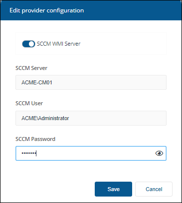 In the Edit provider configuration pop-up, slide the SCCM WMI Server toggle to on and complete the displayed form using the following information as guidance: