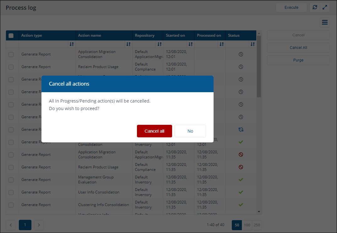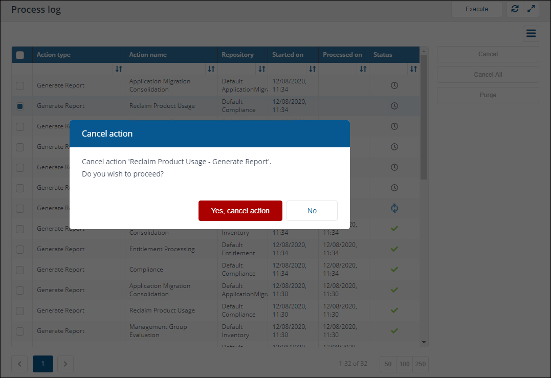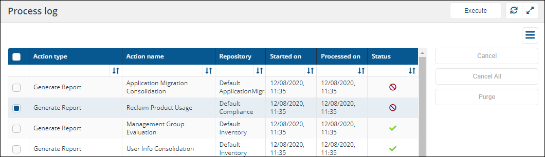 action(s) you want to cancel from the Process log table by checking the box at the left-hand end of each action's row. -