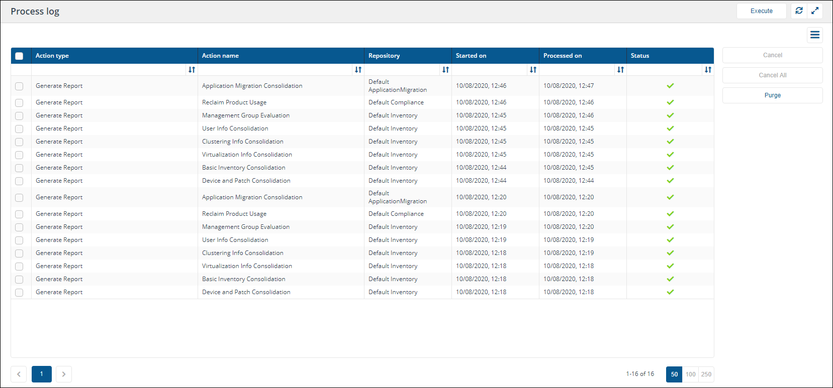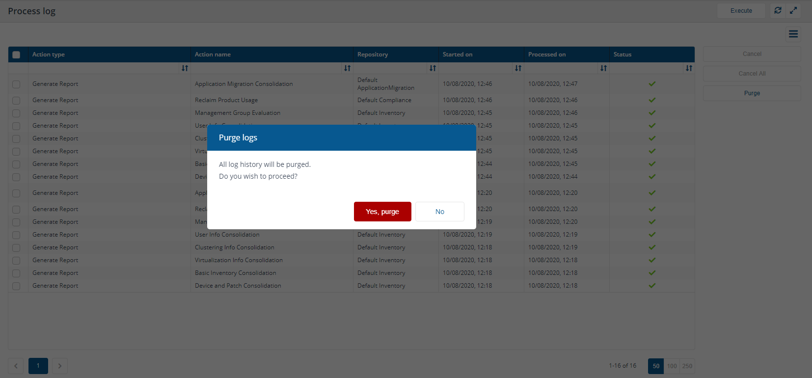 The Process log page lets you view the progress of queued actions, cancel actions that are pending and purge process log history.