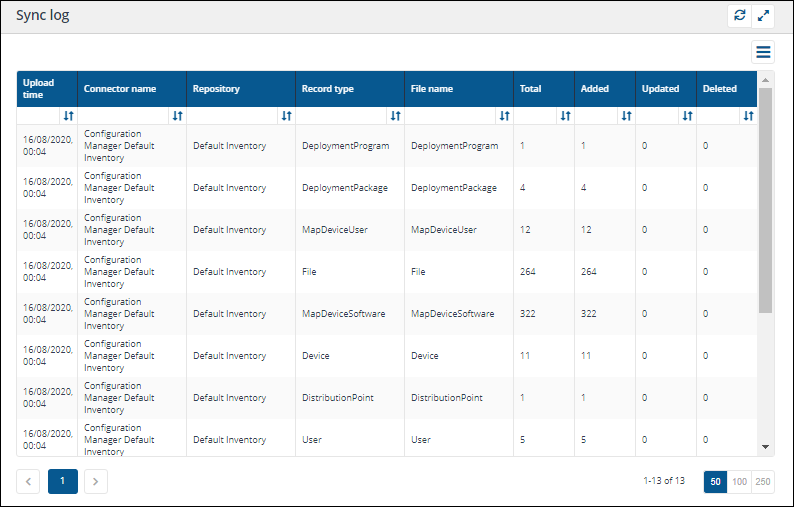 The Sync log table displays a list of records that have been uploaded to repositories by connectors. The columns displayed are described in the following table: