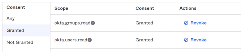 Grant okta.users.read. Click on Grant for this permission, you will see Granted in the Consent column.