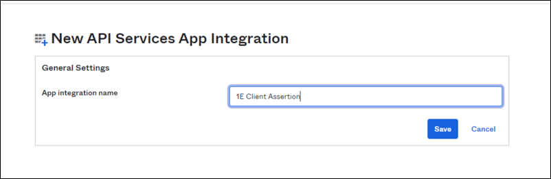 In the New API Services App Integration section, fill in the App integration name field. We suggest you name this 1E Client Assertion and then click on Save.