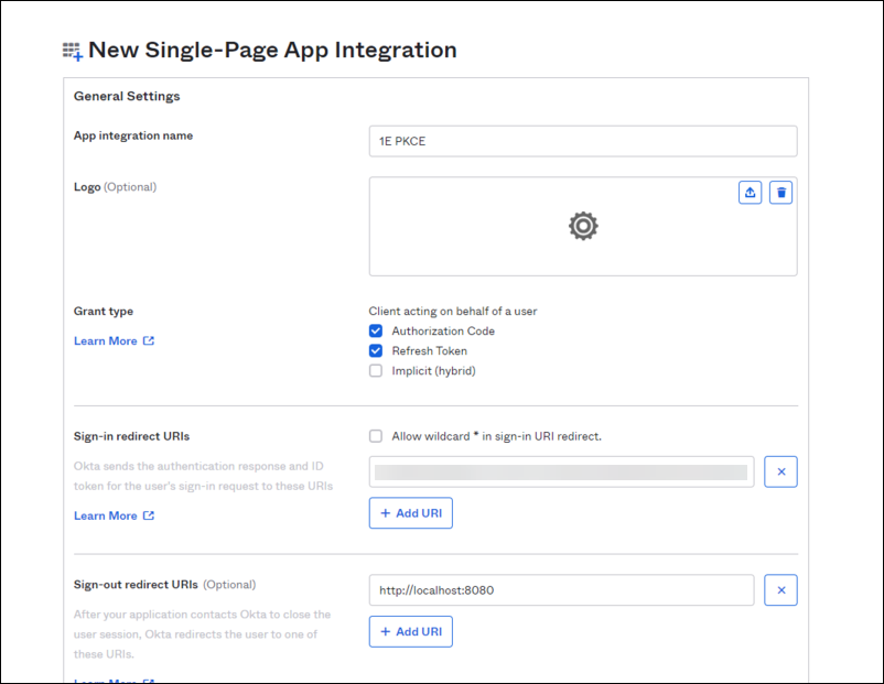 In the App integration name field set the name for the application, we recommend calling this 1E PKCE.