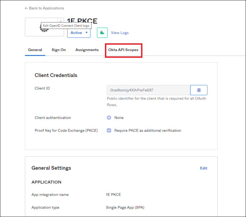 Navigate to the 1E PKCE Application and click on Okta API Scopes.