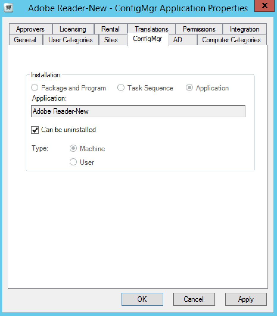 Only applicable to Configuration Manager applications. It lets you modify the uninstall options for the application. Ticking the Can be uninstalled checkbox lets you uninstall the application. For applications that use Package and Program or Task Sequence for installation, you can change the un-installation option to use either a package and program or task sequence.