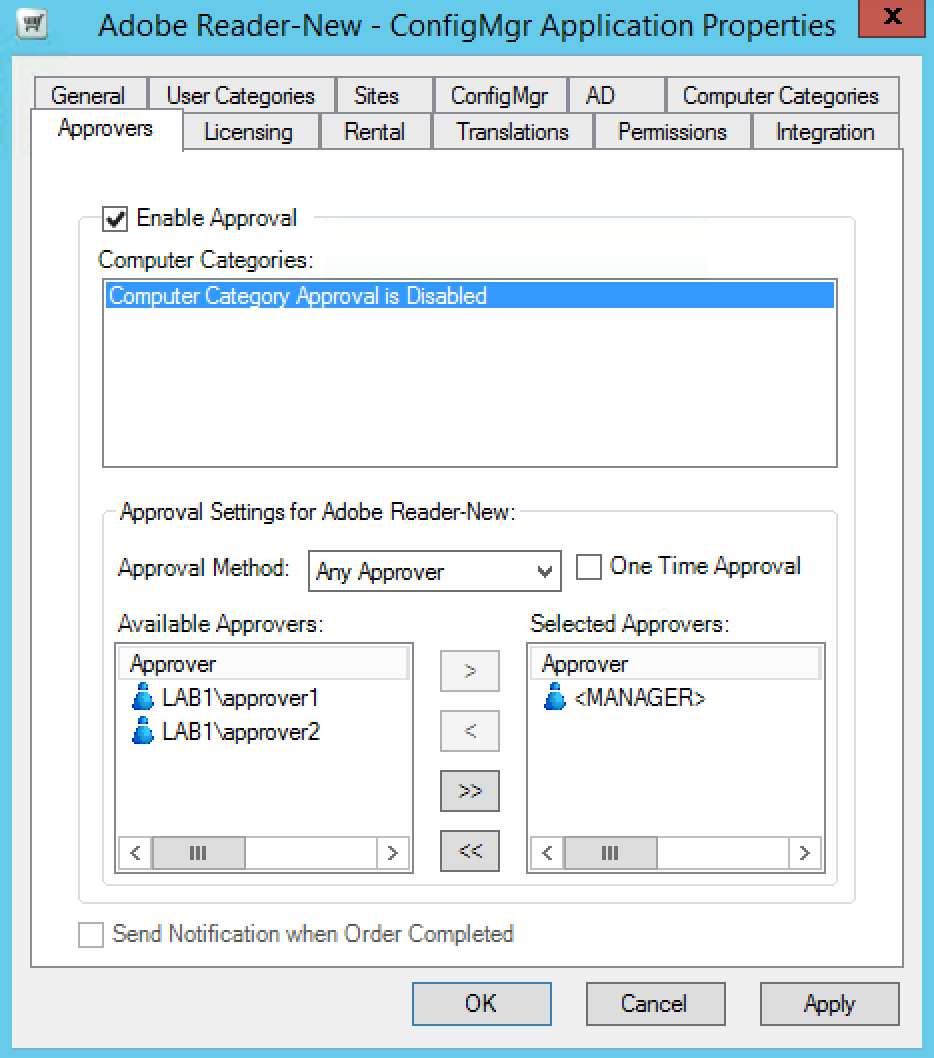 The Send Notification when Order Completed checkbox is only enabled when an application is not subject to approvals. It has more relevance for non-Configuration Manager applications and is used to send an email notification when an order has been processed. For example, if access to a specific share is granted to anyone who requests it, the notification email can be used to provide instructions for accessing the share when used in conjunction with the Additional Notification Link text in the General tab.