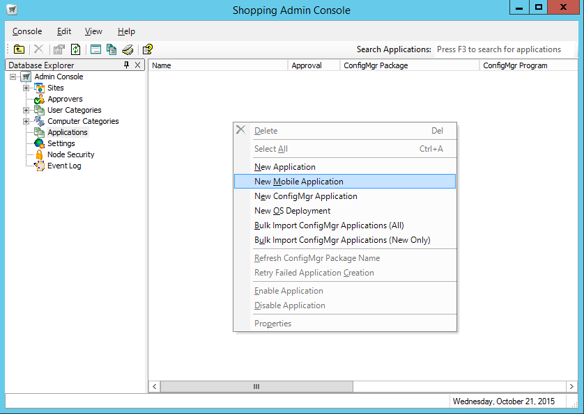 On the right pane, right-click and from the context menu, choose New ConfigMgr Application.