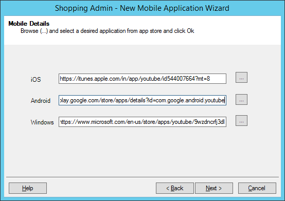 On the Mobile Details screen, define the URLs to the respective app stores which initiates a download for the app on the user's mobile device when they browse the Shopping Web portal. Click ... to default to that particular app store for the application.