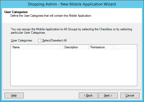 On the User Categories screen, choose the category that determines which users see the application in the Shopping Web portal. In our example, we have not added any user categories yet so by default, the application will be visible in the globally available Miscellaneous user category.