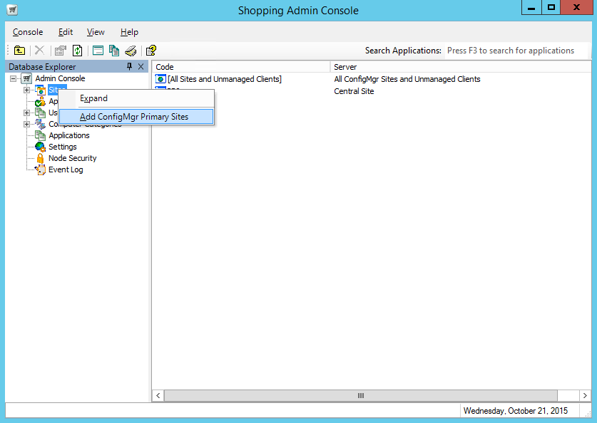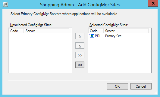 The Shopping Central installer automatically adds the Configuration Manager Central Site to the list of Sites in the Shopping Admin console. You must manually add all other Primary Sites where Shopping is made available. To make Shopping available, install the Shopping Receiver on the Primary Site. This is a security feature and also to ensure that content is made available at the Site before users are able to request applications.