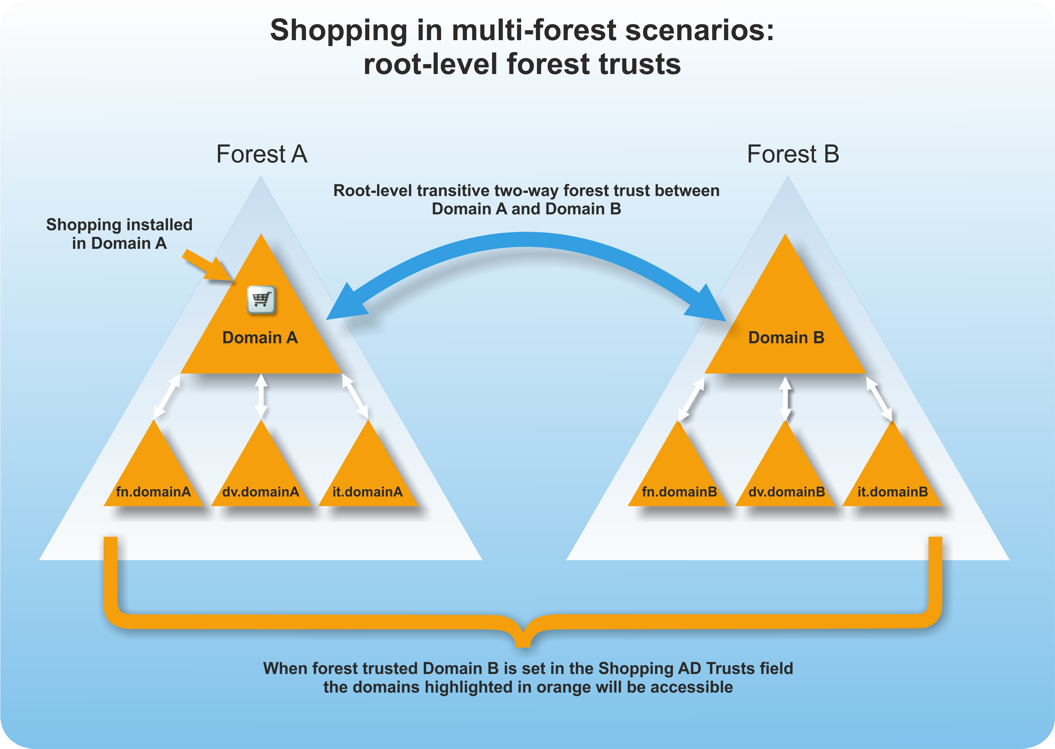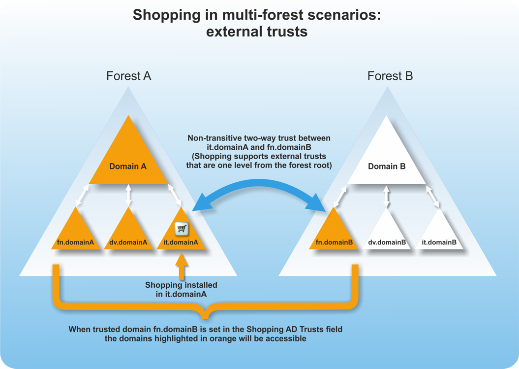 Shopping is designed to cater for two types of multi-forest Active Directory configurations: root-level forest trusts and external trusts. Each trust type has different requirements for where Shopping components must be installed, and rules that must be followed when creating Shopping accounts and groups.