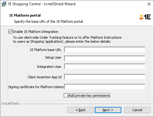 Ensure you have configured all the prerequisites listed above, and then follow the steps outlined in Installing Shopping Central or Upgrading Shopping until you reach the screen where you can enable the 1E Platform integration.