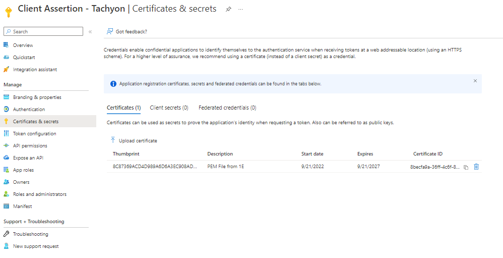 Navigate to Azure Active Directory > App Registrations > 1E Client Assertion > Certificates and upload the certificate.