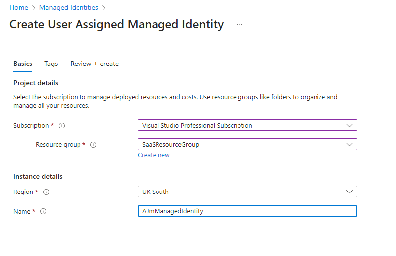 From the Azure portal, create a managed identity associated with an appropriate resource group.