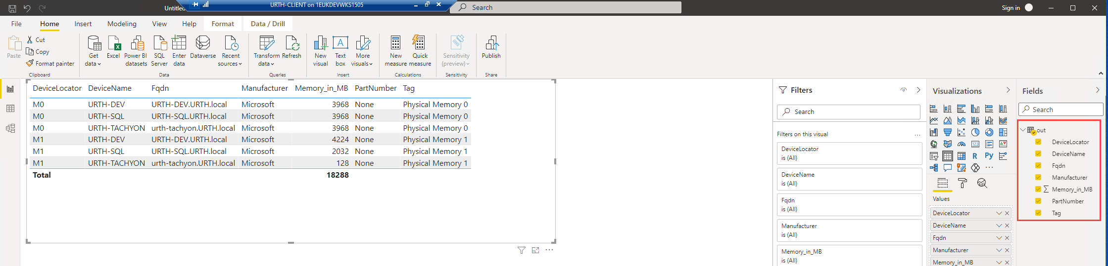 We will invoke an instruction which returns memory details for each device, as shown below. Because this is an aggregating instruction, we specify the -Drilldown parameter to retrieve detailed per-device memory information. Our target scope is defined as our lab domain which in this scenario returns data for three devices.