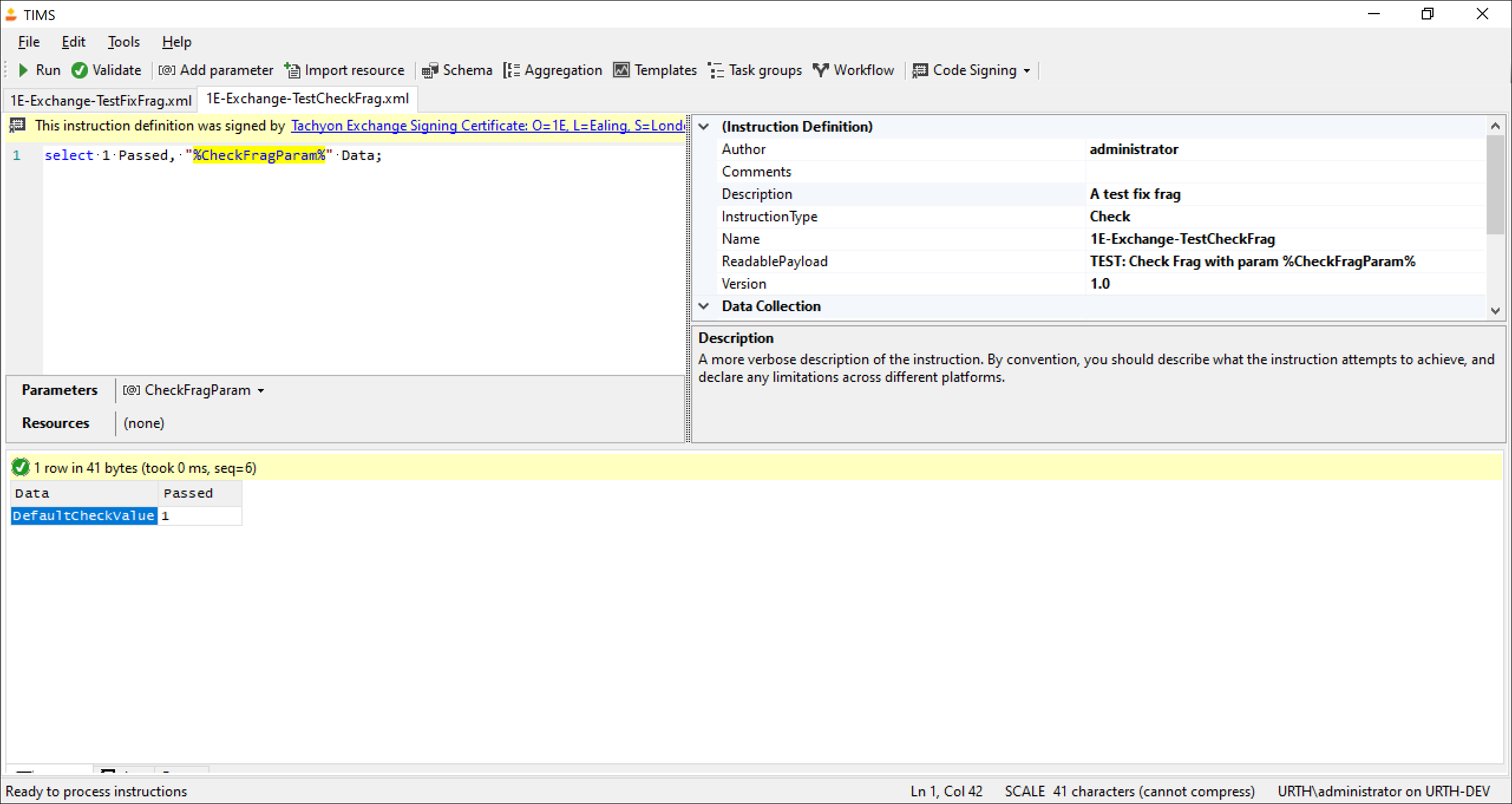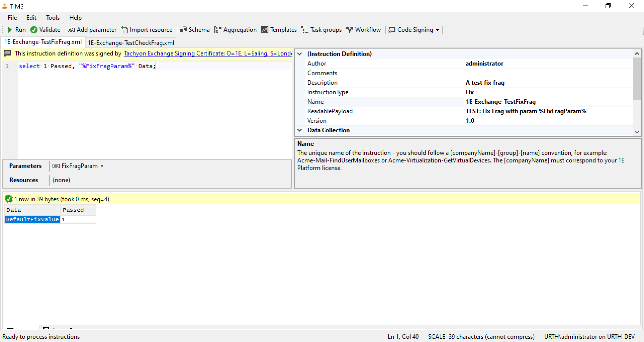 Because the check fragment always returns 1 for its passed value, the fix fragment will then always be automatically invoked. It will, in turn, have the value DefaultFixValue passed down to its FixFragParam parameter.