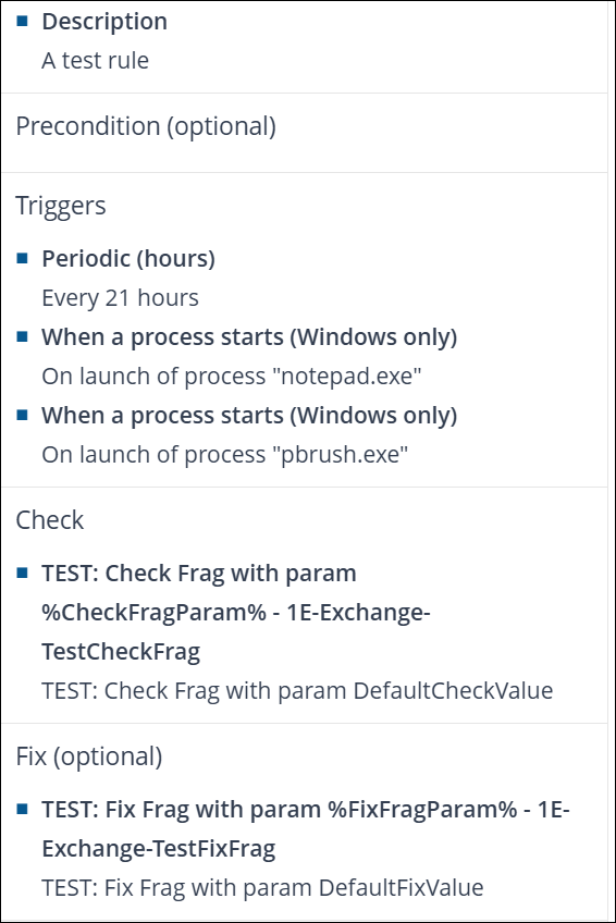 In this example, we have a test rule with a check and fix fragment. We set up the test rule so that the check fragment is triggered every 21 hours. We add two more triggers to the rule. Both are process start triggers and they take a process name as a parameter. For test purposes, we use notepad.exe and pbrush.exe as the executables.