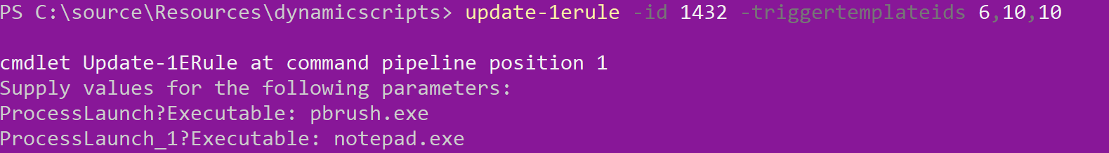 update-1erule -id 1432 -triggertemplateids 6,10,10 -IntervalHours?IntervalHours 42 -ProcessLaunch?Executable notepad.exe -ProcessLaunch_1?Executable pbrush.exe