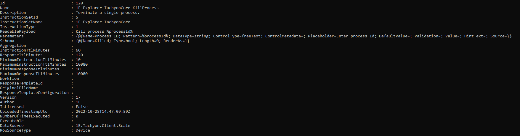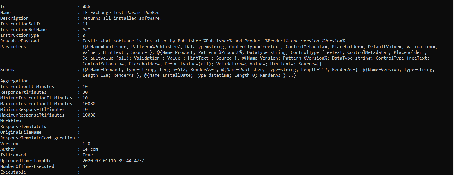 This cmdlet returns the metadata for each instruction in the supplied set. Metadata content appears as shown below. For more information on each property, refer to Integrating with 1E > Consumer API reference in the PDF version of the 1E SDK documentation.