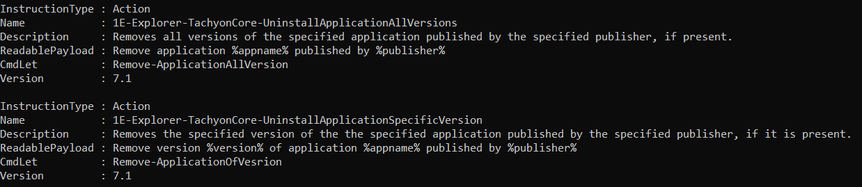 This cmdlet returns metadata about all instructions. For more information on metadata elements, refer to the Integrating with 1E > Consumer API reference in the PDF version of the 1E SDK documentation.