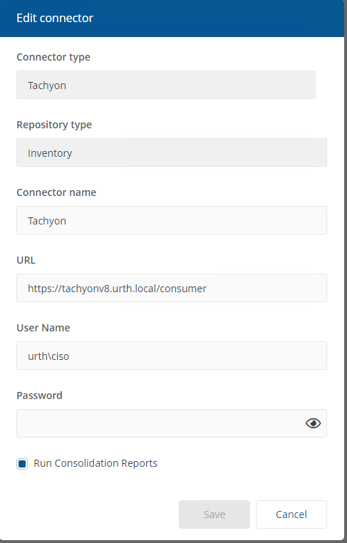 On the connectors screen, create a new connector called Tachyon. Associate it with the Inventory repository and point it at the appropriate consumer URL on your platform server. In this example, the platform server is tachyonv8.urth.local.