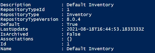 To obtain the repository Id value, we can query for all SLA repositories and locate the Default Inventory repository. It is the Id of this repository that we then provide to the sync-1ESLAManagementGroup cmdlet.