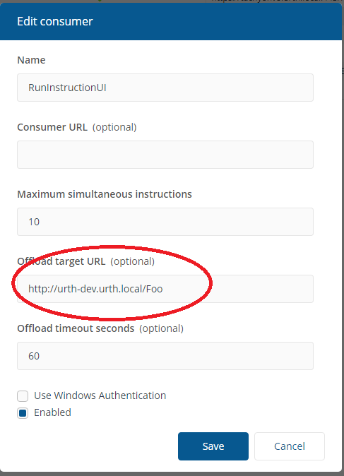 From the settings application, modify the RunInstructionUI consumer to add an offload target URL as shown below. Change the server name to be the name of the machine on which you are going to run the test PowerShell cmdlet. Also disable Use Windows Authentication.