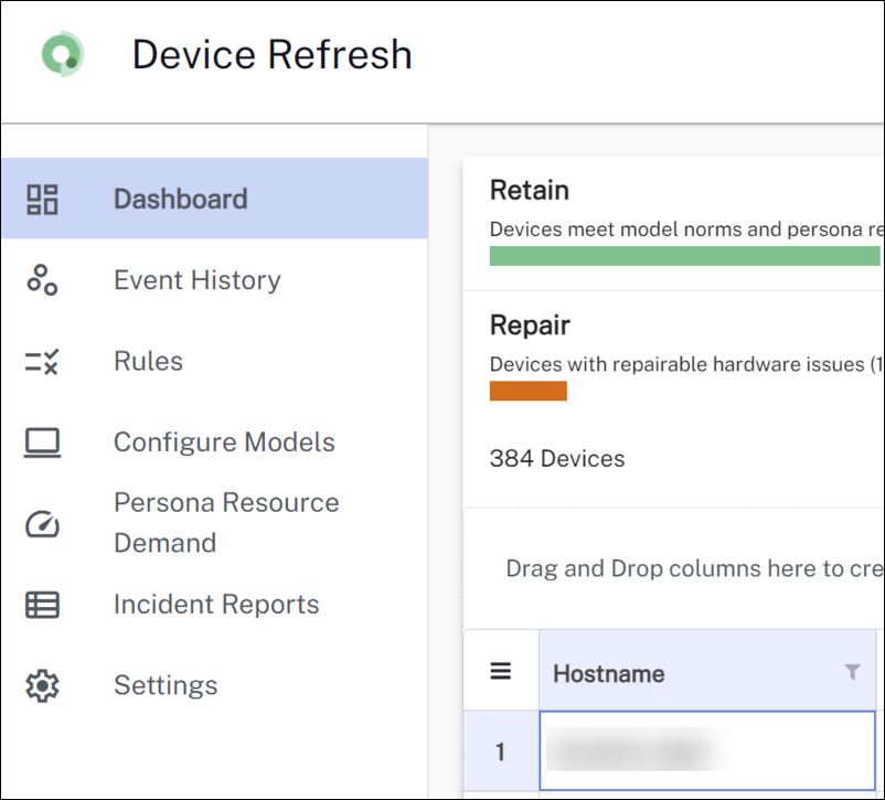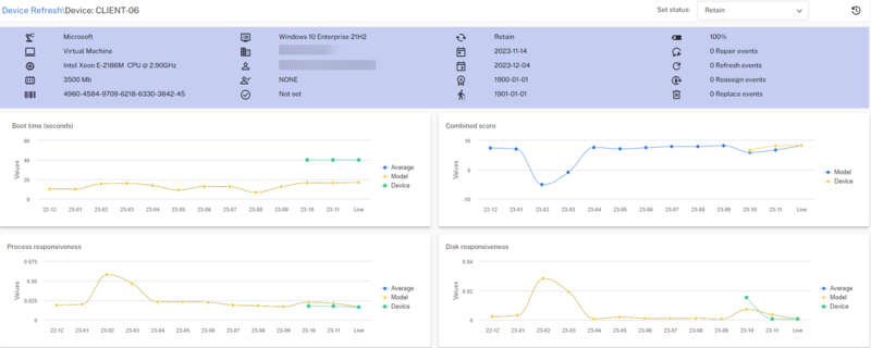 Device refresh status: Get data-driven recommendations on whether devices should be retained, replaced, repaired, reassigned, or refreshed. These statuses are determined from events that impact device performance, responsiveness, and stability. IT teams can use the statuses and their related event data to understand issues with a device before user complaints arise.