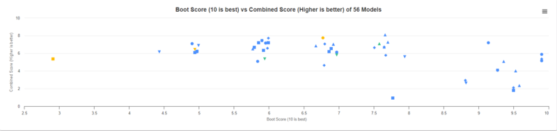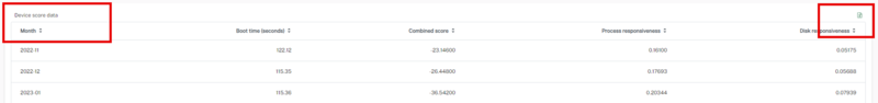 The combined score (Y Axis) is calculated using various data points obtained from regularly updated DeviceResponsivenessDetails. A higher score indicates better performance. The Boot Score (X Axis) is calculated using the average boot time. A higher score indicates better performance.