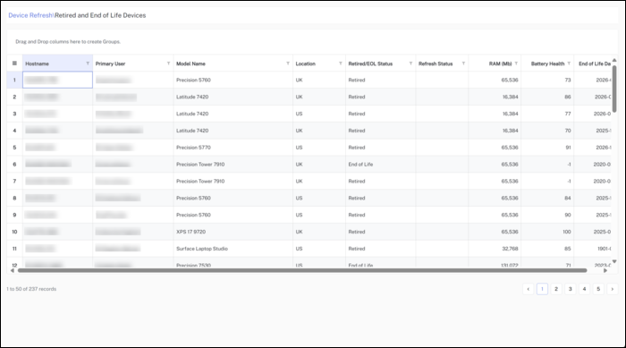 Click any of the three KPI panels to view the Retired and End of Life Devices page where you can view any devices marked as Retired or End of Life.