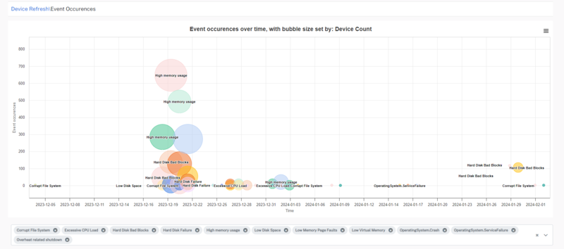 Click Event History from the Device Refresh side menu. Event History displays event details over a specified time and shows a bubble chart with a bubble size set by device count.