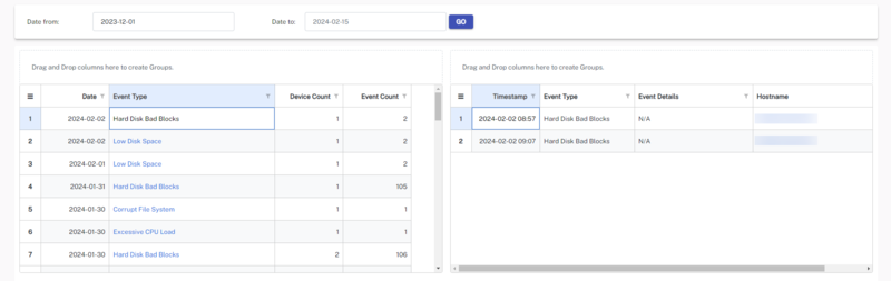 Selecting the Event Type on the left-hand grid shows details of the event and the device name on the right-hand grid.