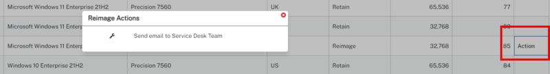 Devices with a refresh status other than Retain will display an Action text. Clicking an Action text prompts actions according to any configured status, such as creating a ServiceNow ticket or sending emails to the user and service desk team.