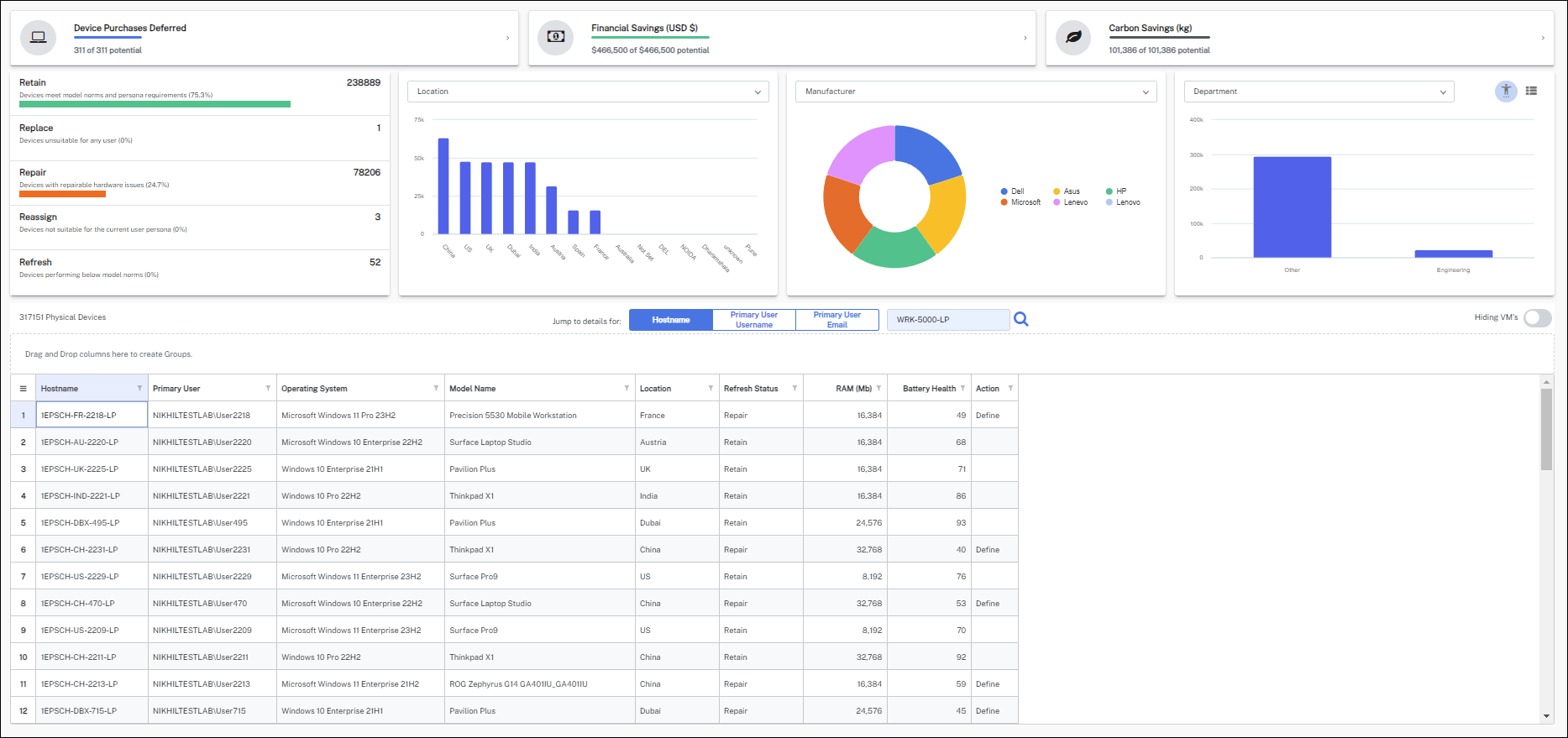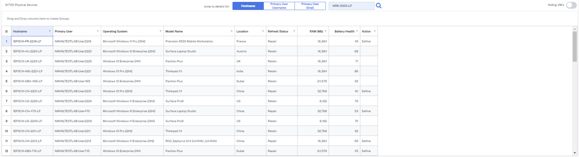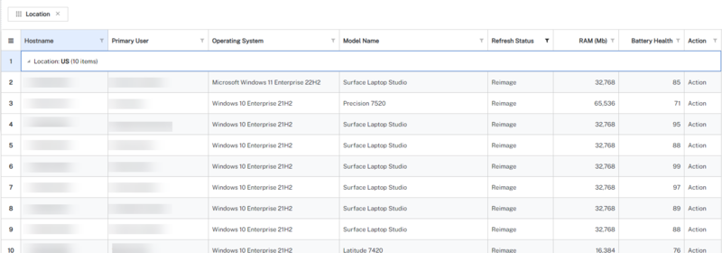 The device grid lists all the devices along with the information that includes Hostname, Primary User, Operating System, Model Name, Location, Status, RAM, Battery Health, and Action. The device grid also allows you to search the devices by Hostname, Primary Username, and Primary User Email.