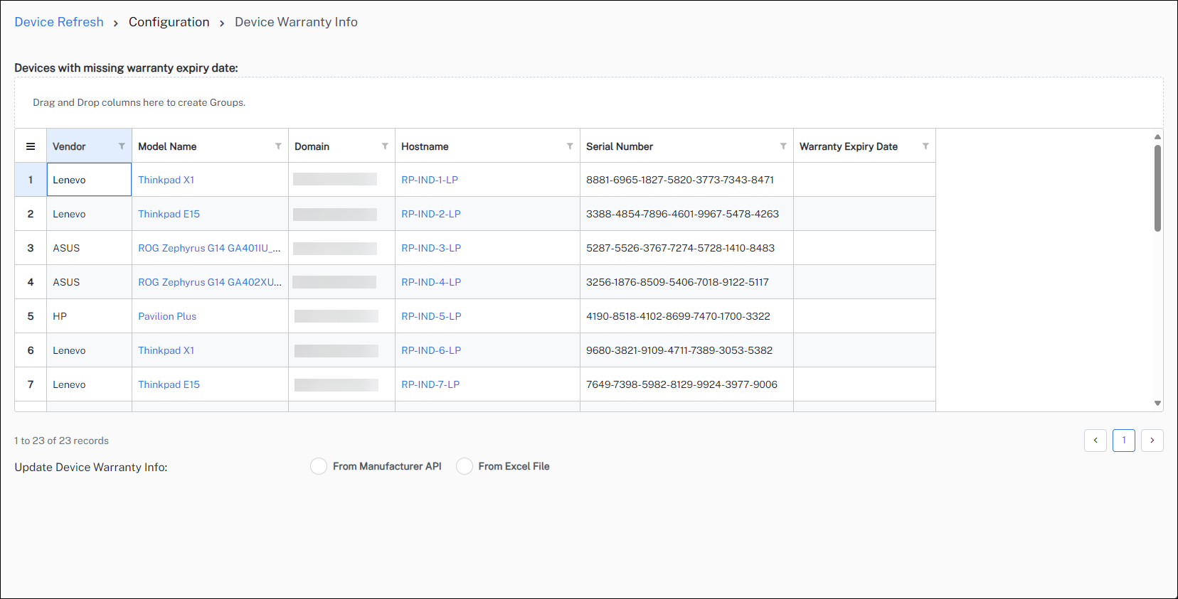 Customers can update the warranty data of devices through the Update Device Warranty Info option on the Device Refresh > Configuration page, which lists devices that have missing warranty information.