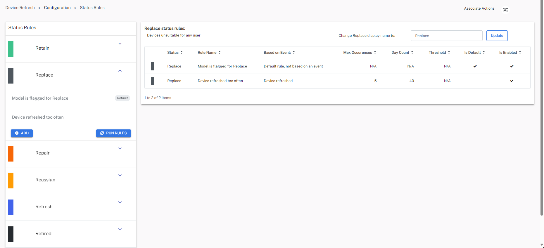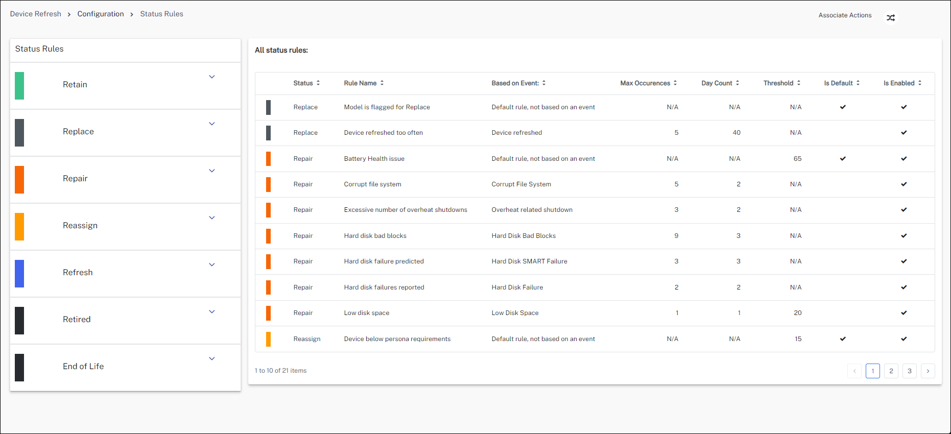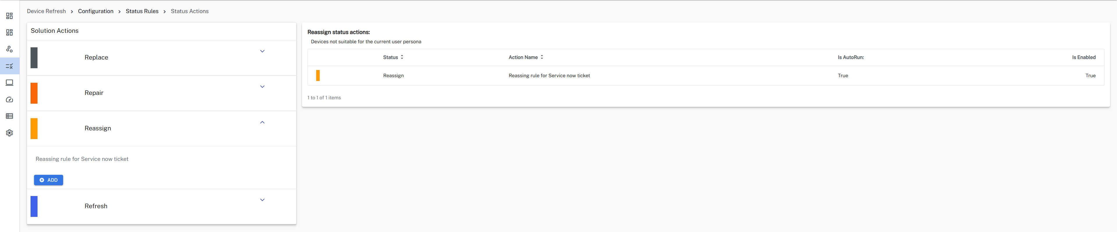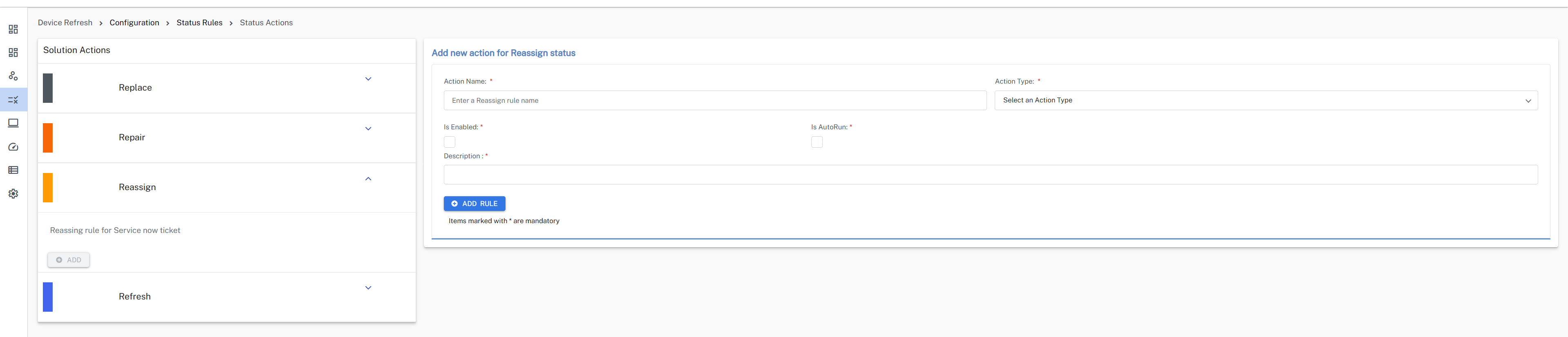You can customize both manual and automated actions for Replace, Repair, Reimage, and Reassign statuses. This includes the option to create email or ServiceNow incident actions based on your preferences.
