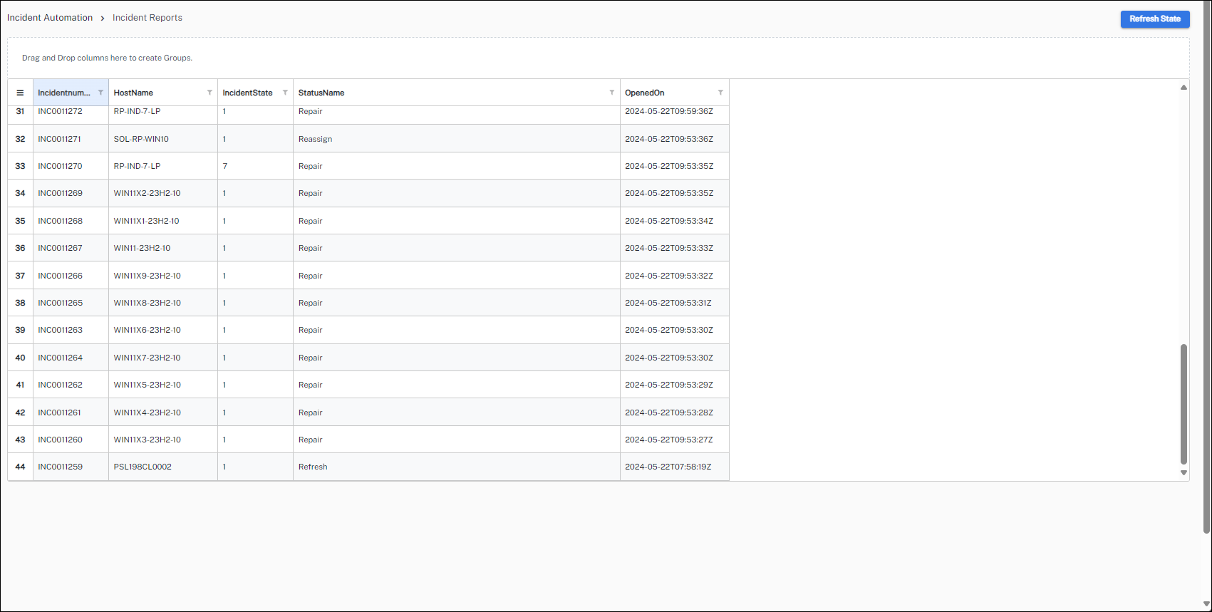 Incident Reports: Where you can view the ServiceNow Incidents created by the status rules defined in Manage Solution Actions.