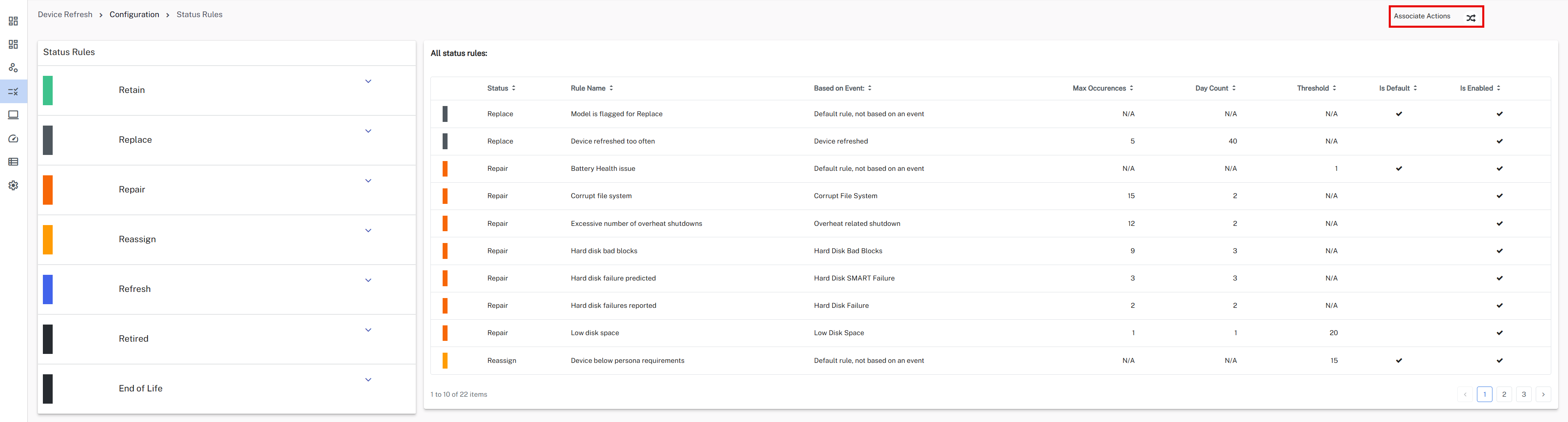 The device view grid lists device information along with its status. Admins can define a solution action for a device status other than retain and then run an on-demand action for that device.
