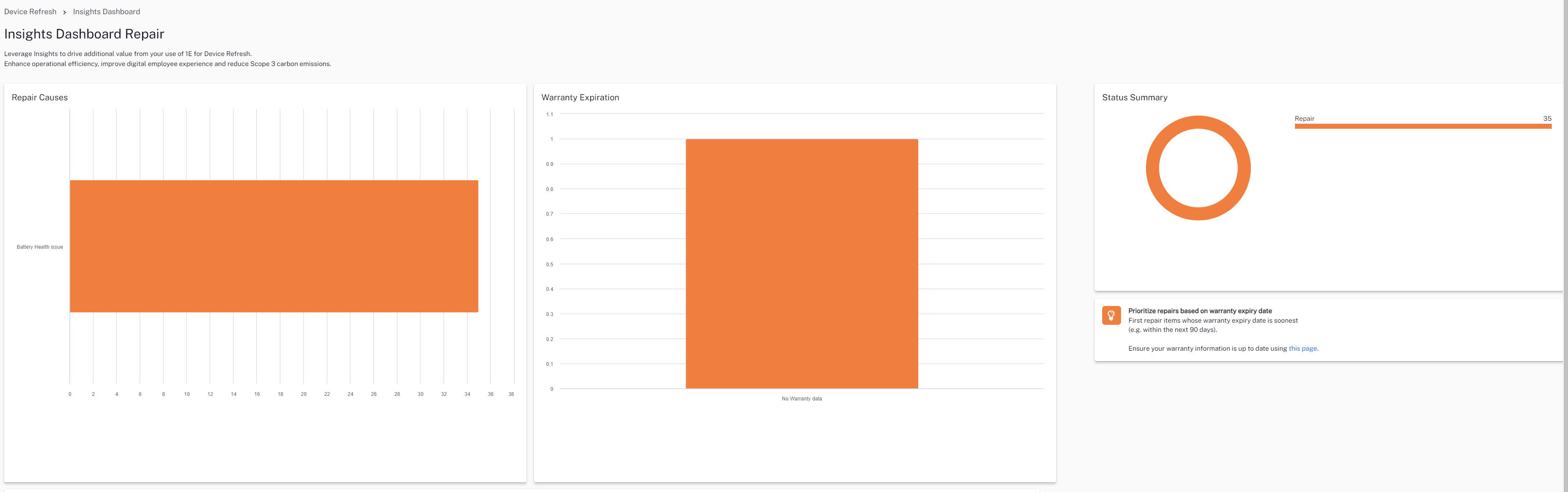 Device Refresh has a dynamic dashboard focused on KPI for reducing cost and carbon impact. You can identify “good” and “bad” devices and models, and see how this data changes over time. With configurable rules that change status in response to real-time events, you can make smarter purchasing decisions and leverage warranties to extend hardware life. You can explore Device Refresh by using the left-hand expandable menu and selecting from the following options: