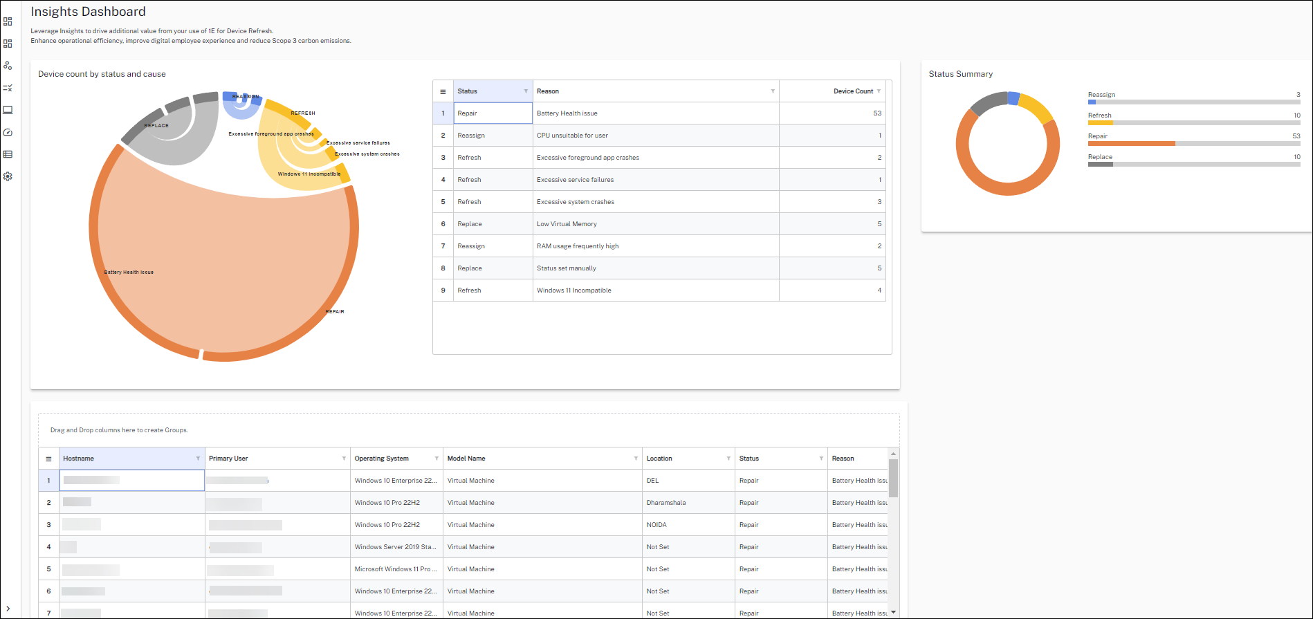 Clicking a status summary displays a device grid where you can review details like Hostname, Primary User, Operating System, Model Name, Location, Status, and Reason. This device grid is displayed at the bottom even when no status is chosen. Using the device grid, you can apply filters for location, status summary, and reason.