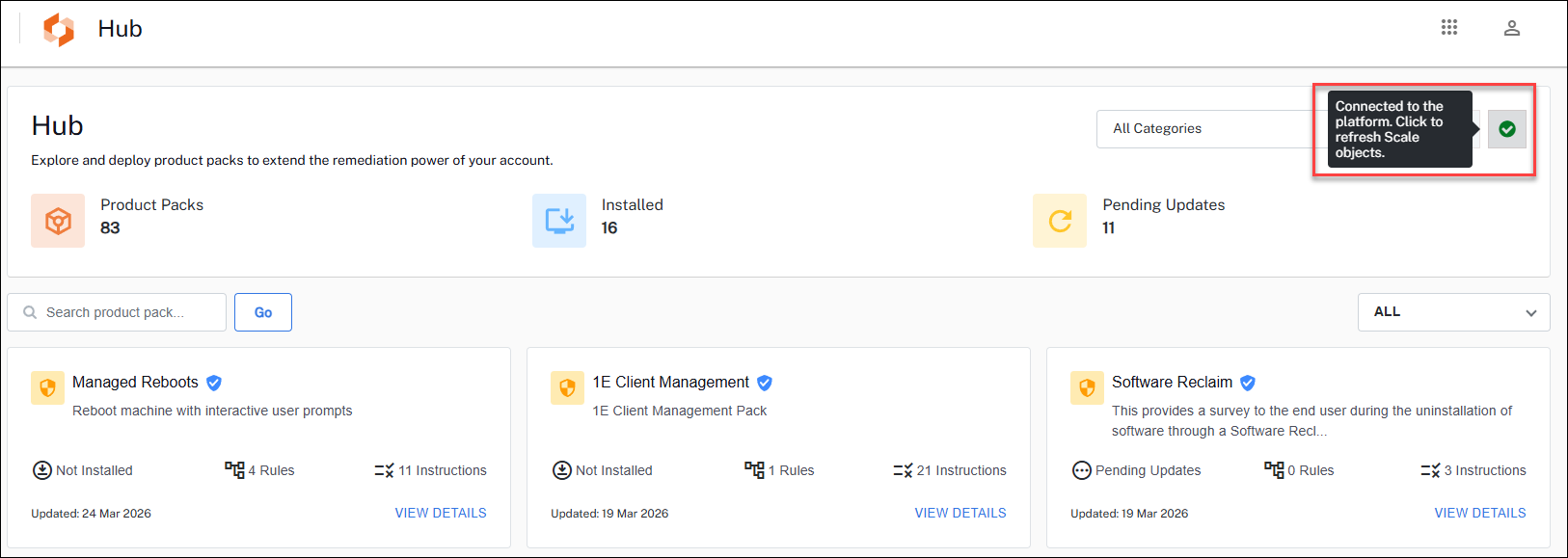 The green checkmark icon indicates that the Hub is successfully connected to the platform. This connection utilizes the authentication token of the logged-in user. Clicking the icon initiates a platform sync to retrieve the latest data on SCALE objects.